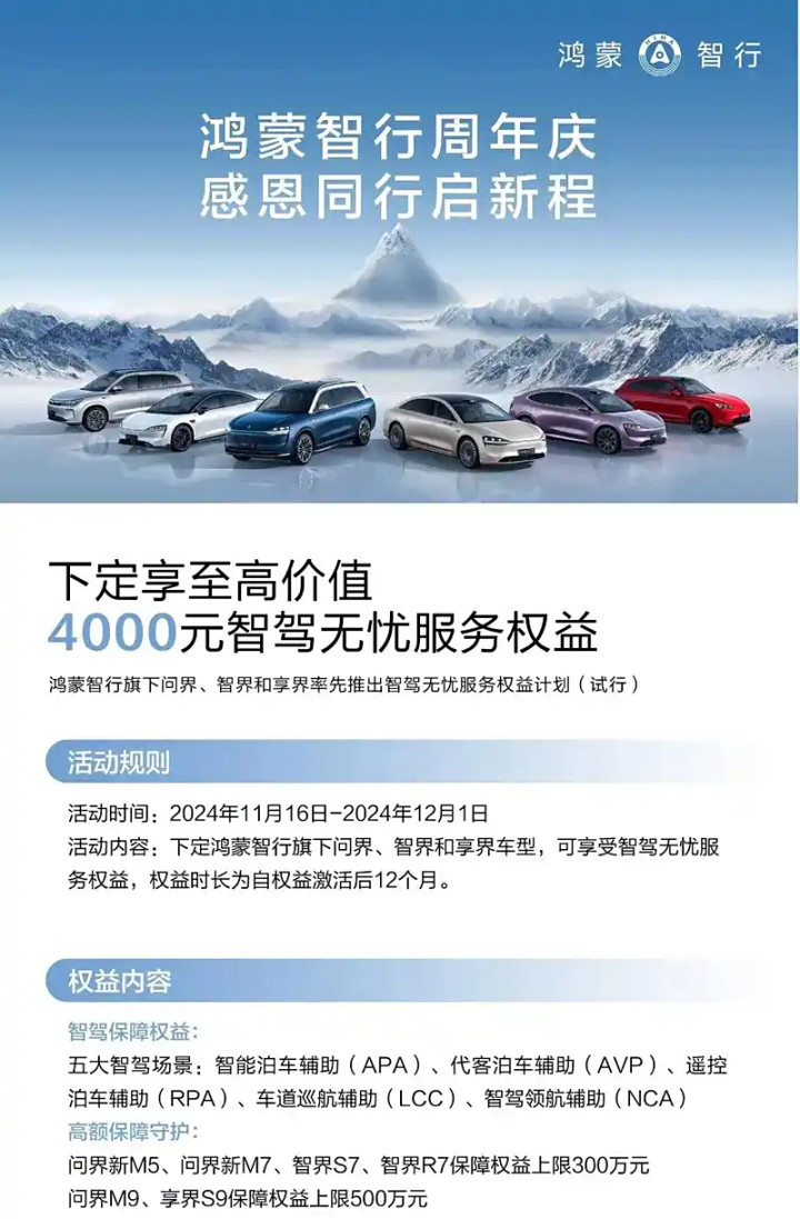 其实现在网上大肆追捧的自动驾驶,其实只能被称为辅助驾驶,即使特斯拉在国外最新版本的FSDV12,它也没有能力能独立完成驾驶工作,作为驾驶员也要做好随时接管的准备,并且出了任何事故都是由车主承担,如果你用过智驾就会发现,经常需要紧急接管,说到这就得提一下华为,作为目前智驾的第一梯队,24年11月16日到12月1日这个时间段购买指定车辆赠送智驾无忧服务,如果智驾发生了交通事故,最高给你赔付到500万,这里我们来理解一下,厂家给智驾做出了服务,我们要不要完全相信智驾?我的建议是不要,大家要知道这个服务权益是一种销售行为,一个促销行为,本质上就是一个额外的保险,生命是自己的,方向盘握在自己手里才是最踏实的,如果真出了事,赔再多的钱又有什么用呢?